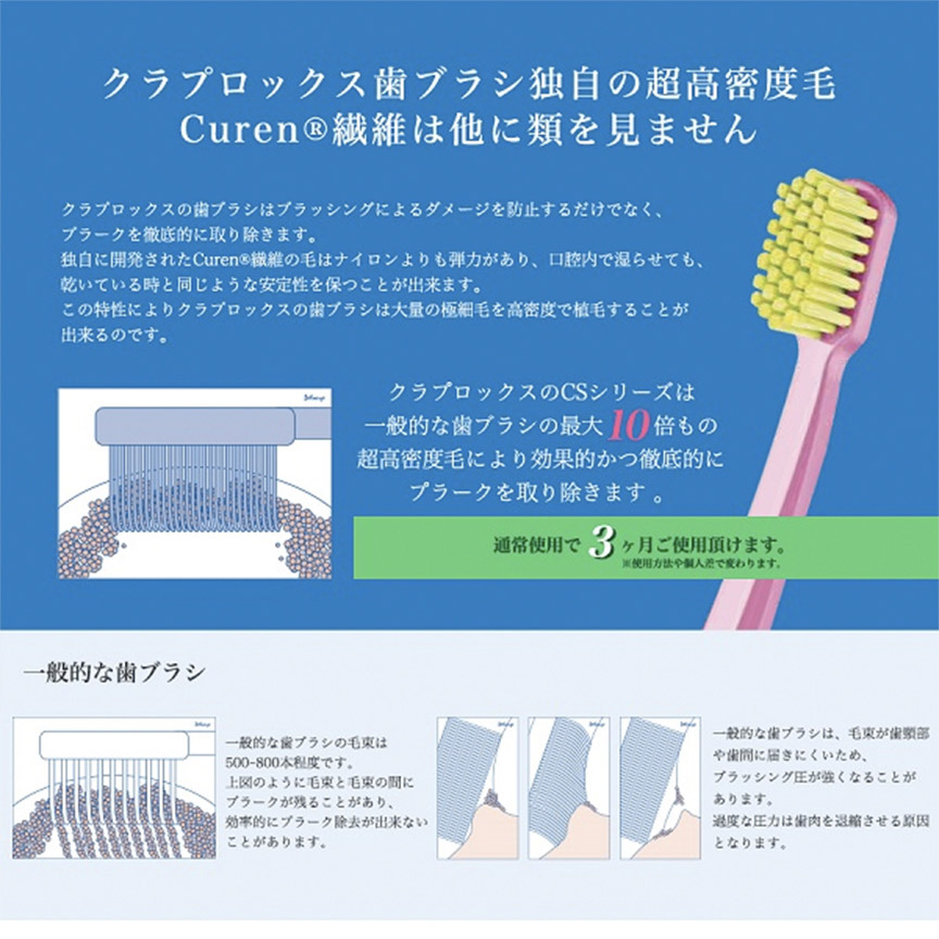 クラプロックス歯ブラシが代表的です。クーレンファイバー独特の細い毛が特徴で、デザインに凝っています。グリップにはスイス国旗が刻印してあり、イタリアのデザイナーです。以下の2本が良く販売されています。