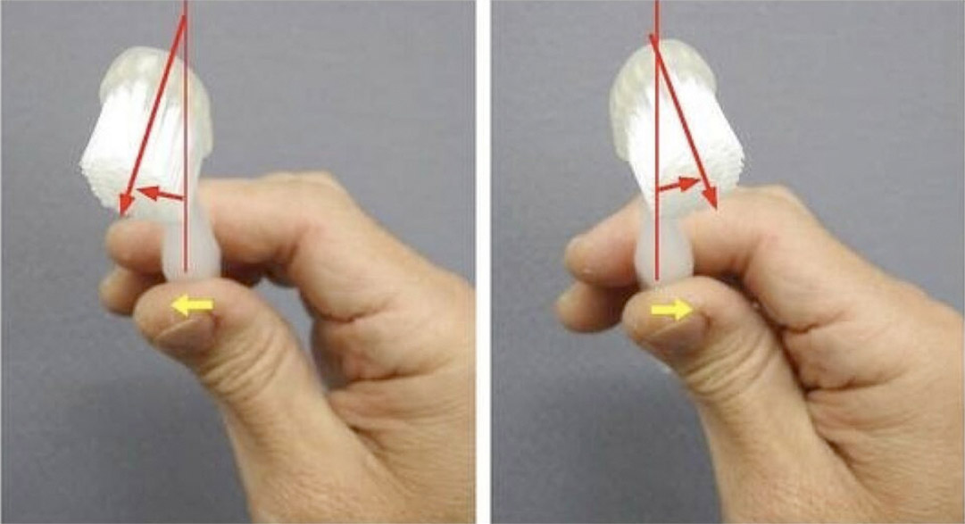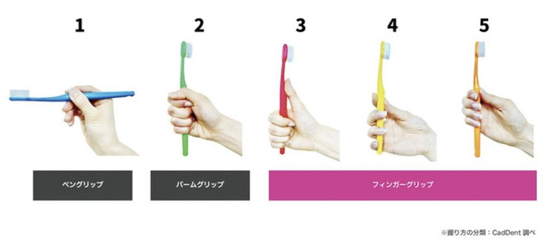 ペングリップ以外の人は3,4,5のいずれかの握り方がほとんどでした。この握り方を私たちは「フィンガーグリップ」と名付けました。さらに、5本の指で歯ブラシを回転させ、手首を返したり、握りなおしたりしている人が多いことも分かりました。