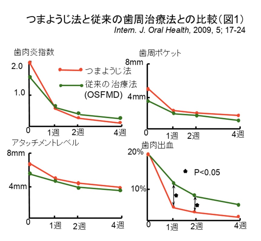 歯肉出血を短期間で改善する(図1)。歯垢除去時間はバス法とフロスの併用の1/2(J.Clin, Periodontol., 1998:25:829-831)。歯の延命ができる(口衛会詩、1988:48:685)。動揺歯の改善、口臭の改善、歯周病急発の防止。既存の治療法は原因除去、本法は細胞増殖促進による歯肉の抵抗力の向上